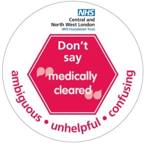 Because he has tweeted publicly on this, I will cite a liaison psychiatrist from London who I know well and trust completely on these matters, Dr Alex Thomson – his trust even had badges made imploring colleagues not to say ‘Medically cleared’ because it is “ambiguous, unhelpful, confusing.” His twitter feed shows a screenshot of an email header after someone emailed “Saying medically cleared is BANNED!” It’s obviously a significant frustration for them as well.