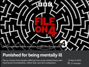 File on Four explores the criminalisation of those of us affected by our mental health, including discussion about Serenity Integrated Mentoring, which I blogged about last week.